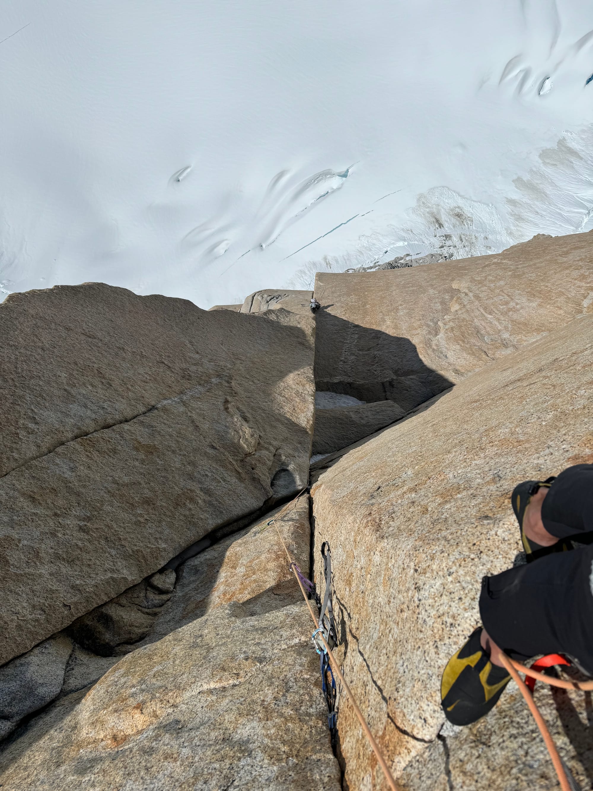 With Sunday's dawn brought blessed warmth and a renewed vigor, and by 7am I started upwards again. We were actually still sort of on schedule, but I felt a lot of self-doubt, and it took a few pitches before I found the flow again. These pitches were the meat of the route: beautiful, steep, perfect splitters, just amazing. Higher, the "Corazón", a giant heart-shaped rock scar, was negotiated handily with the beta from Colin Haley and Tyler Karow's attempt last year.