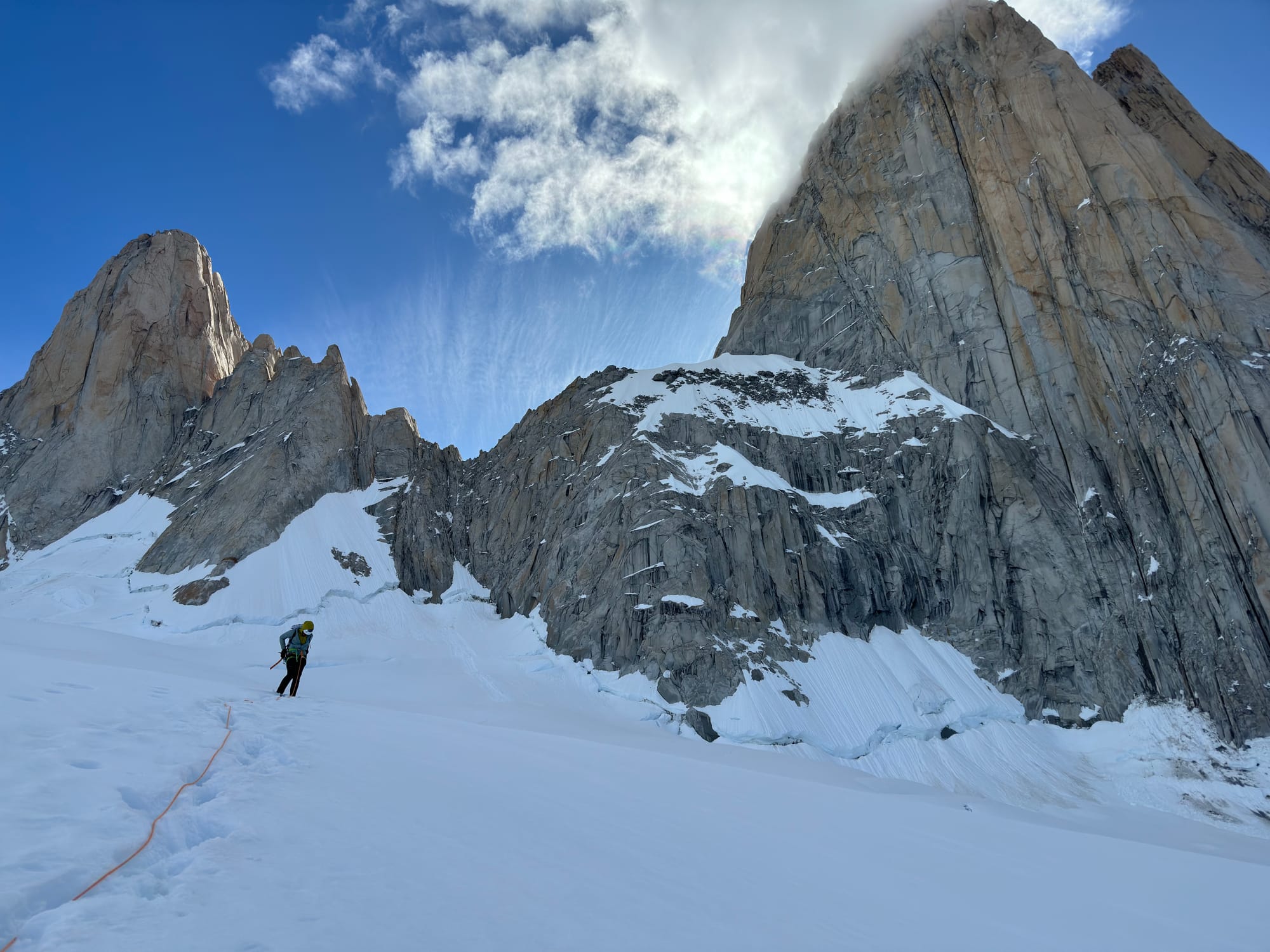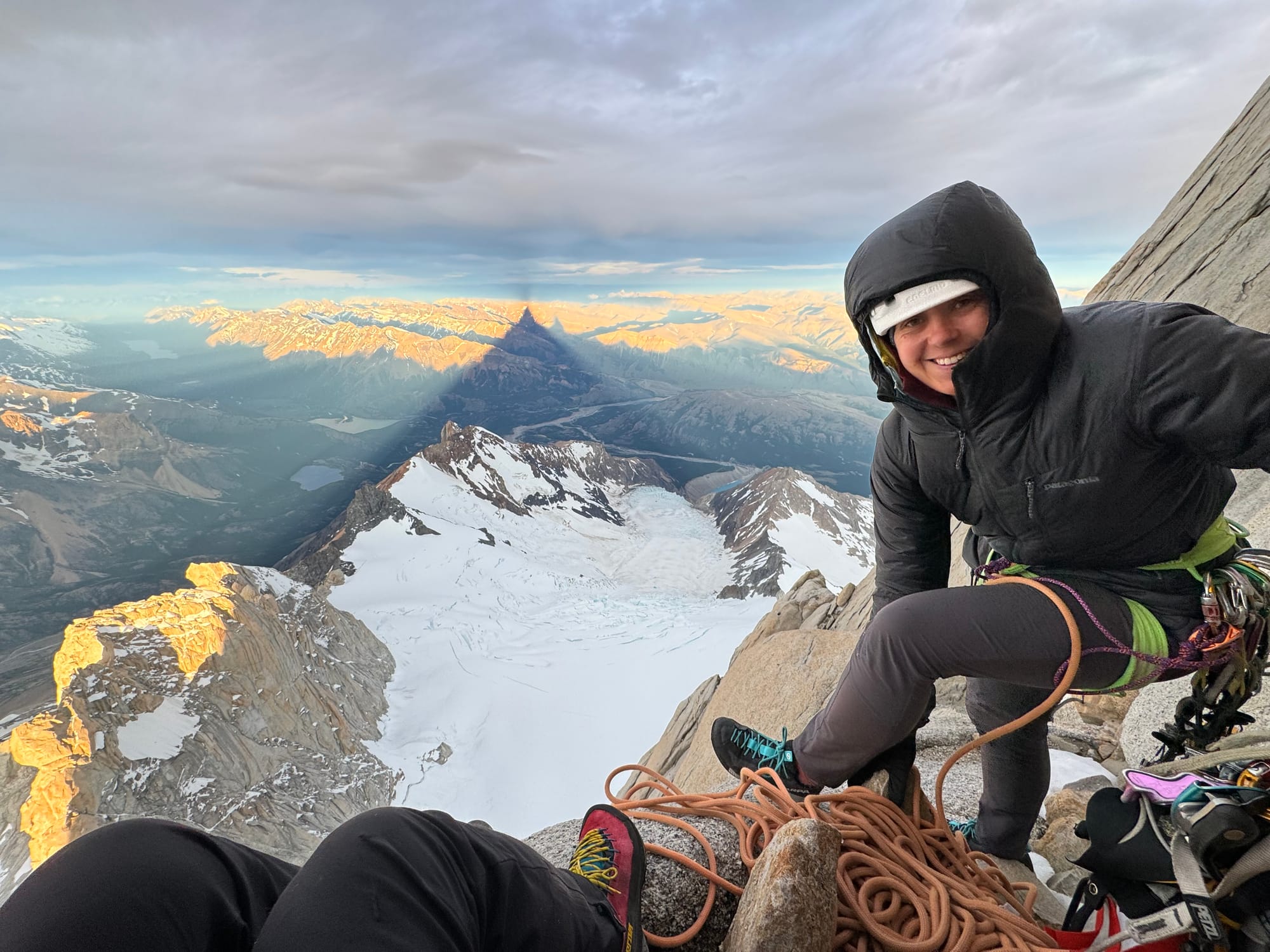 Just under 12 hours after actually starting pitch 1, we topped out pitch 16, "a very comfortable bivy"... but found half a park bench of a ledge, a foot away from the wall — drats! I wonder if this ledge, like the first pitch, had changed over the decades, the comfortable part buckling away from freeze-thaw to this poverty of a bivy. I started chipping away at the ice for melting water, showering the ledge with bits of ice that froze our butts later, while Laura dealt with the ropes. We settled for a fitful, restless sleep sitting up, sharing a single sleeping bag; by 4am we shivering ourselves awake. The streetlights of El Chaltén twinkled afar, and I stared longingly at the horizon for the first wisp of twilight.
