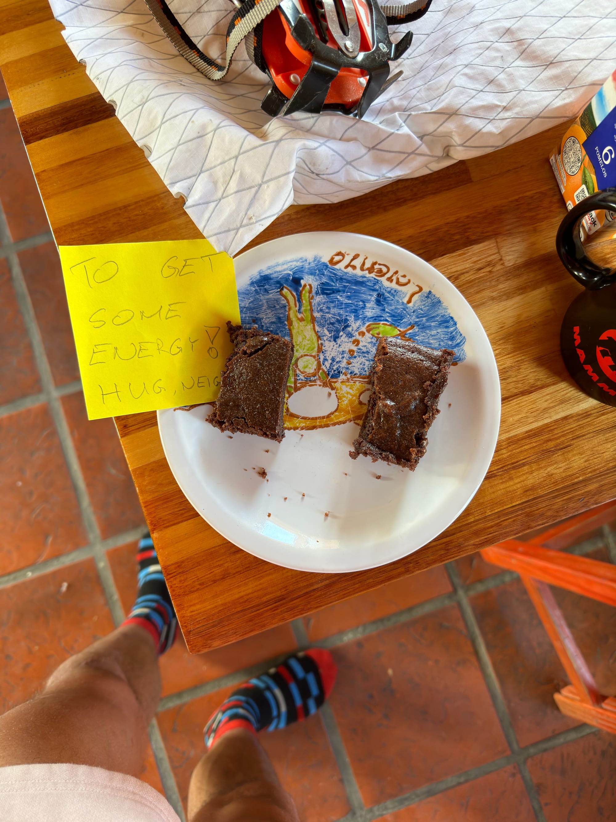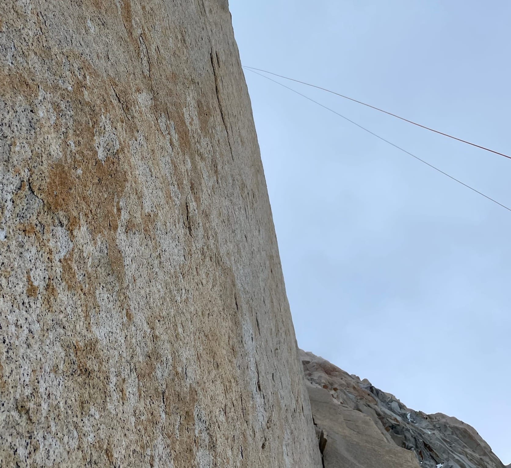 It was probably 11am, still windy, still quite cold, and too cloudy to be sunny, but I had relaxed somewhat given we were halfway down the descent (and that I had found the source of the blood). The severed rope threw into sharp focus how many factors were already stacked against us, and how things could still go very wrong. This galvanized about 10 minutes of concentration, which we used to figure out how to rappel on the remaining lead line and our intact, but super skinny, tagline. Then my brain fog returned. I would find myself staring at the anchor when it was my turn to rappel, my thoughts stalled out, trying to figure out what to unclip and clip, completely bewildered.